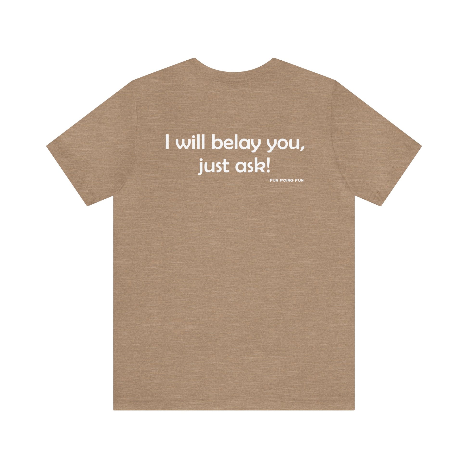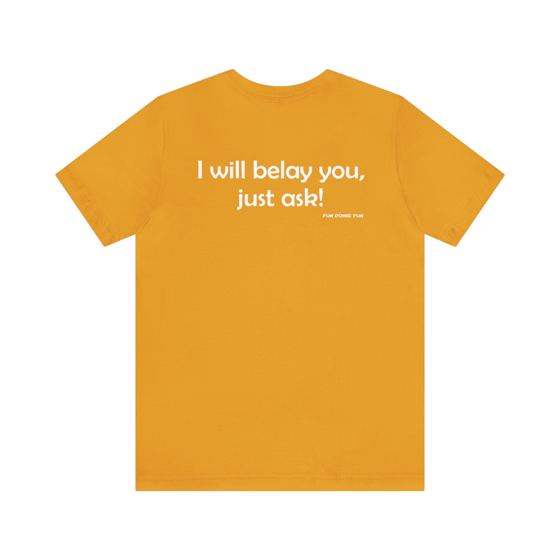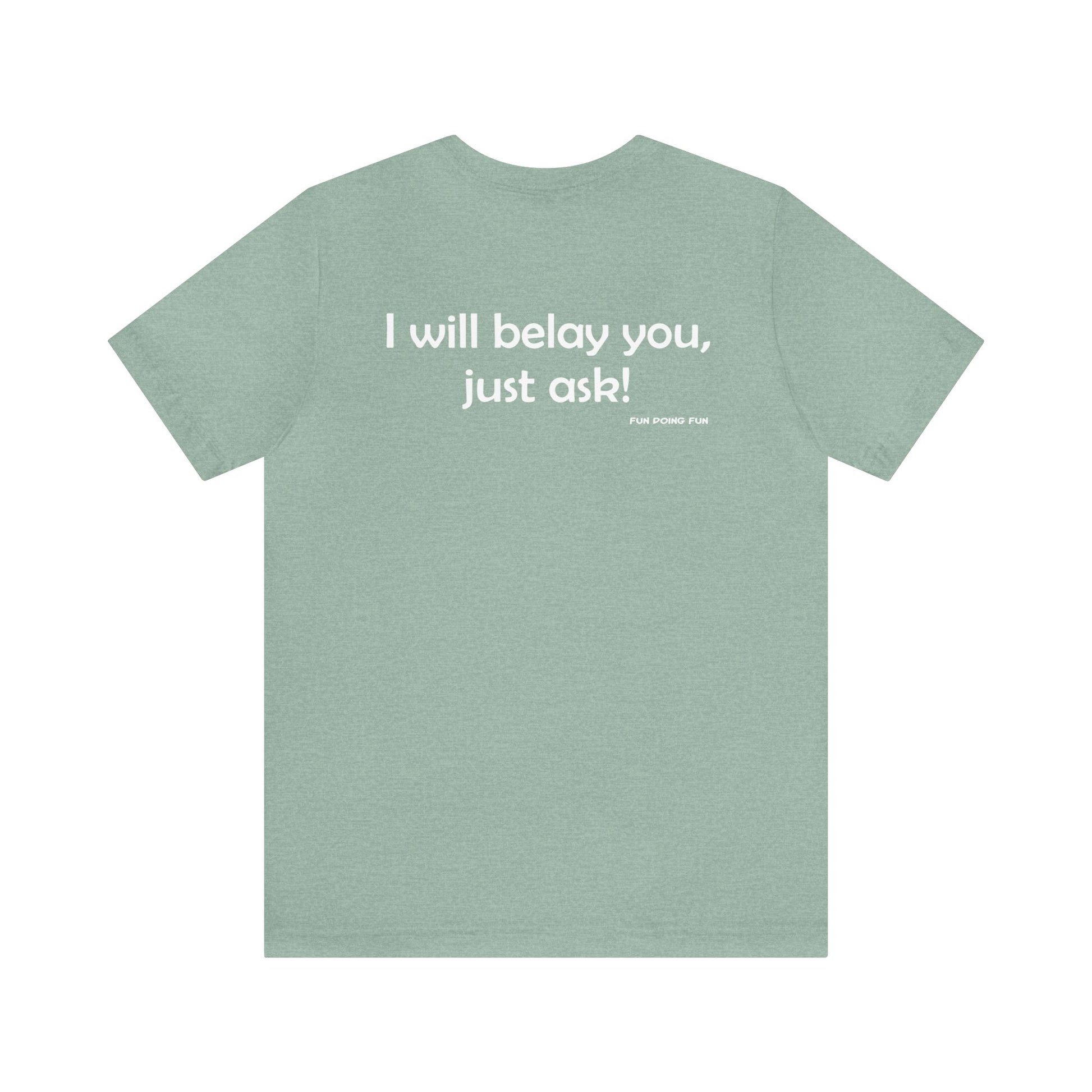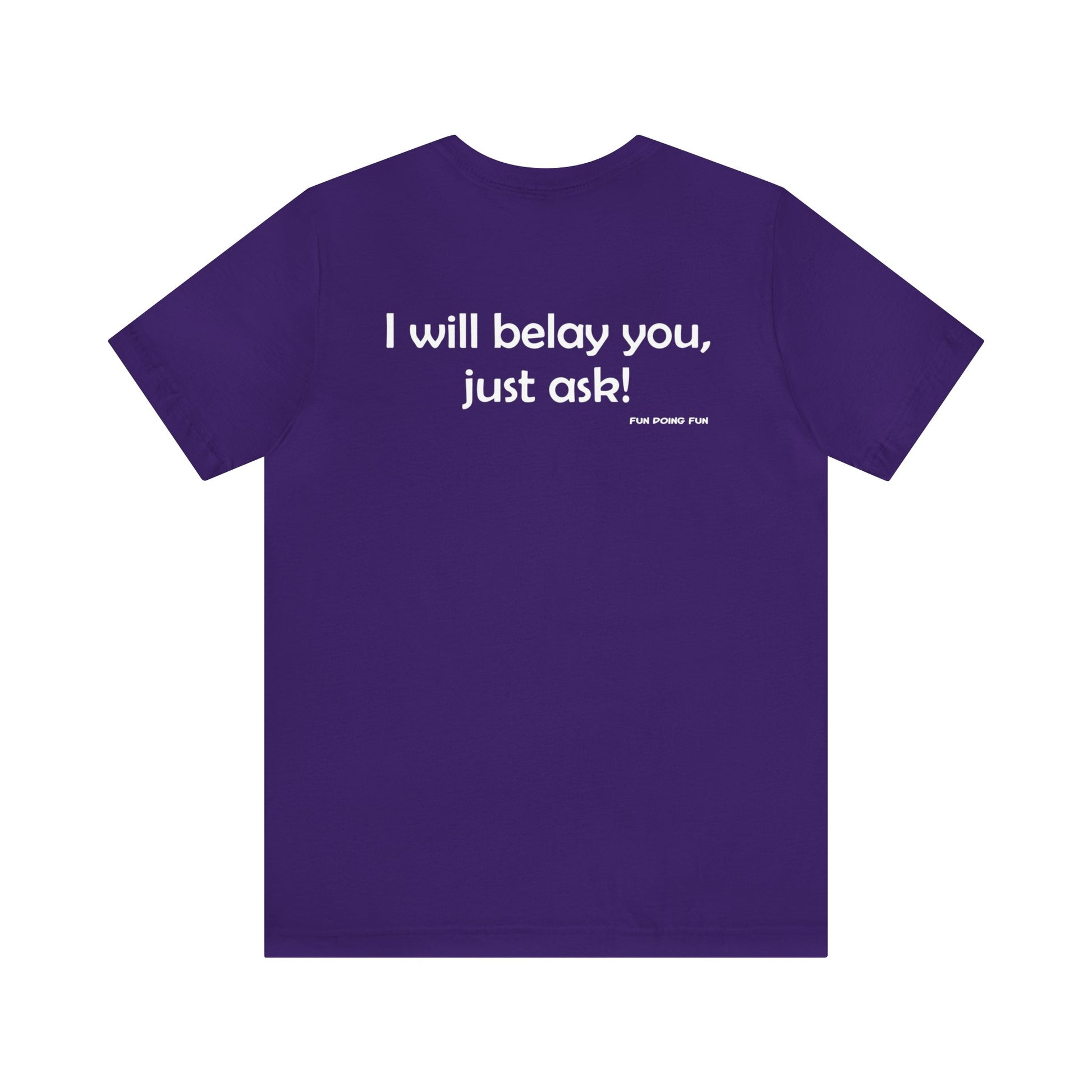 Get Belayed - The idea of this shirt was to let other climbers know you're available to belay or trade belays with them. This shirt has print on the front and the back. For more information please visit