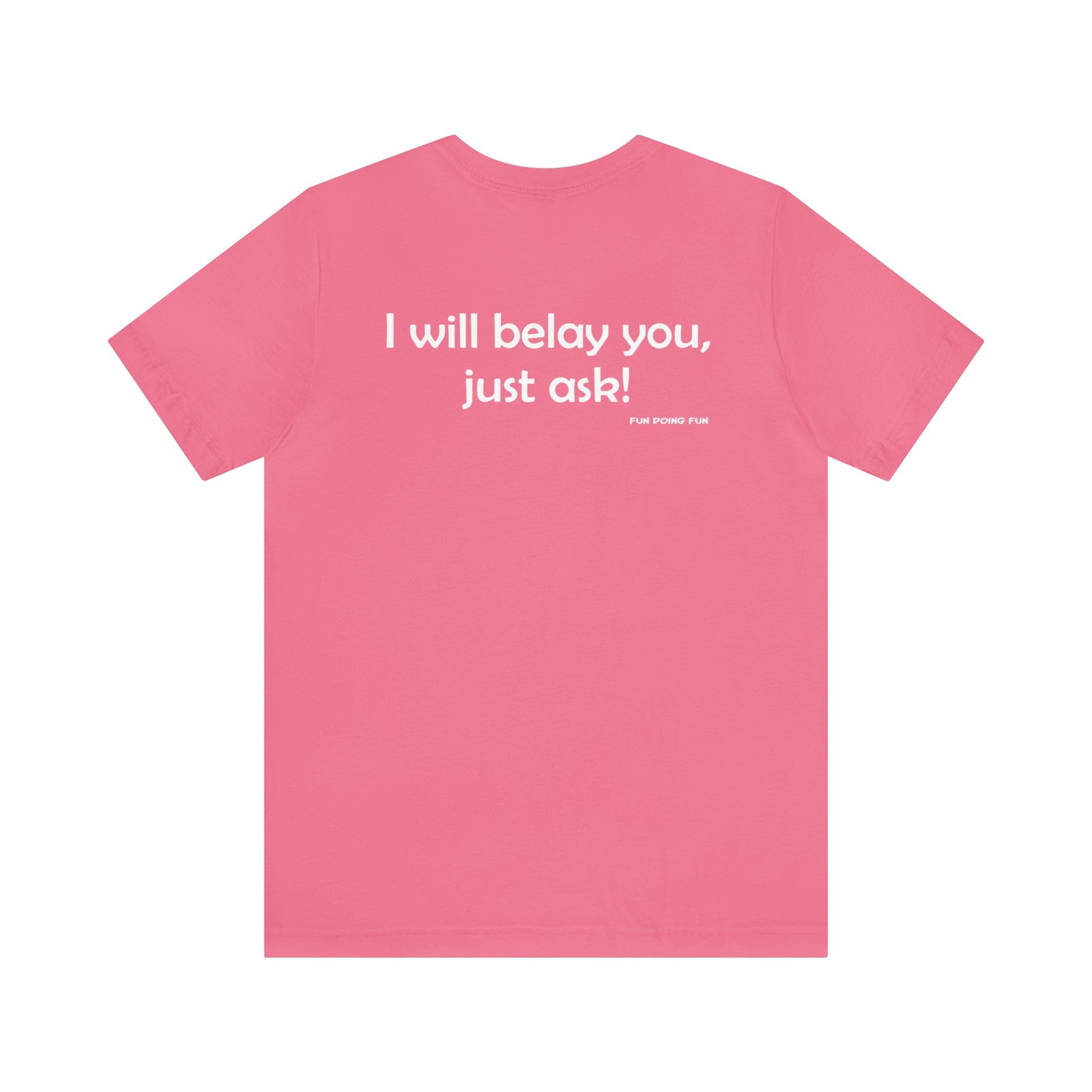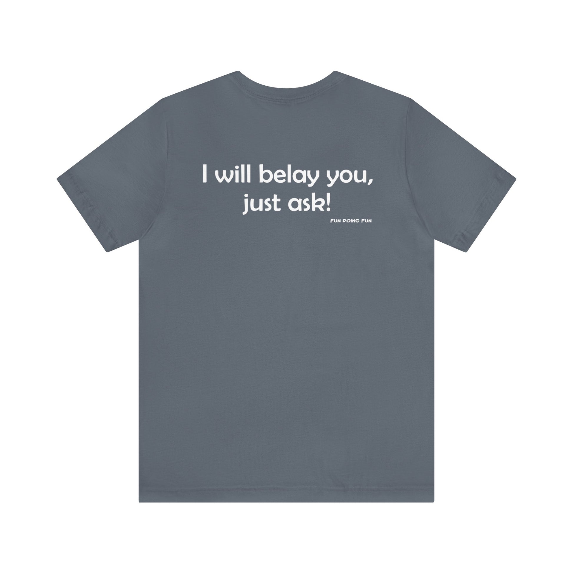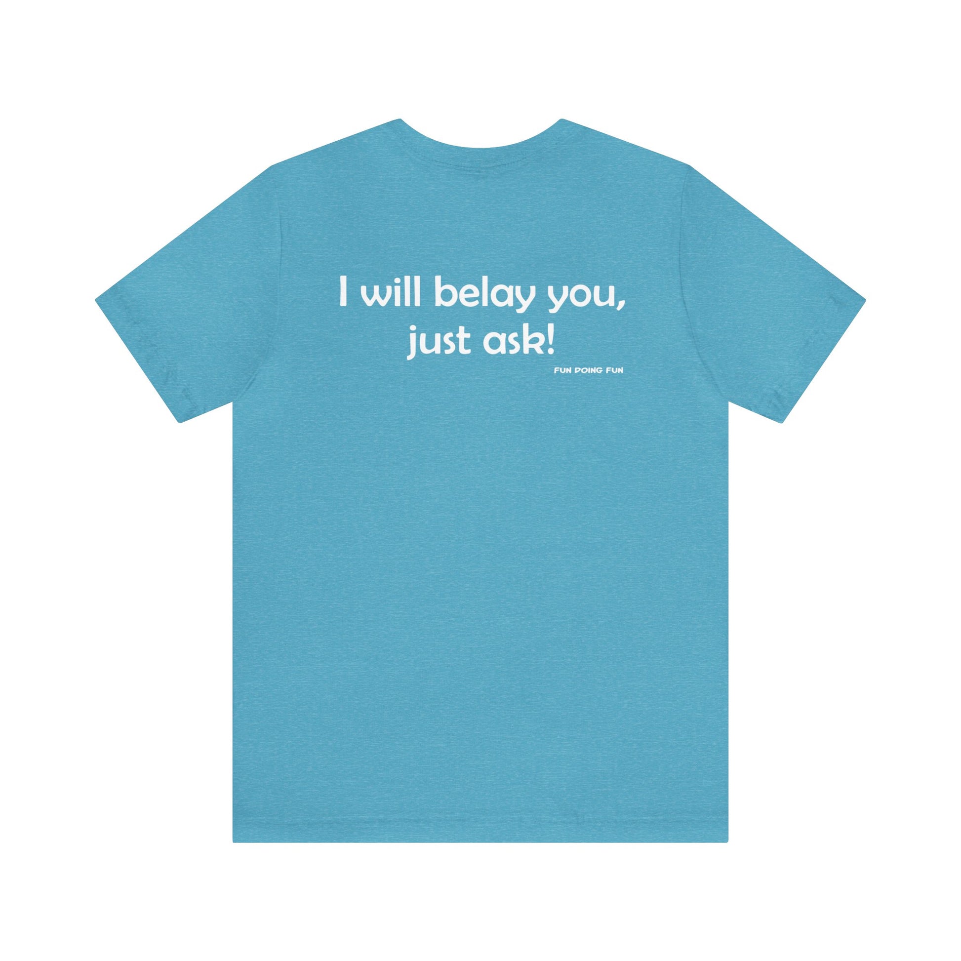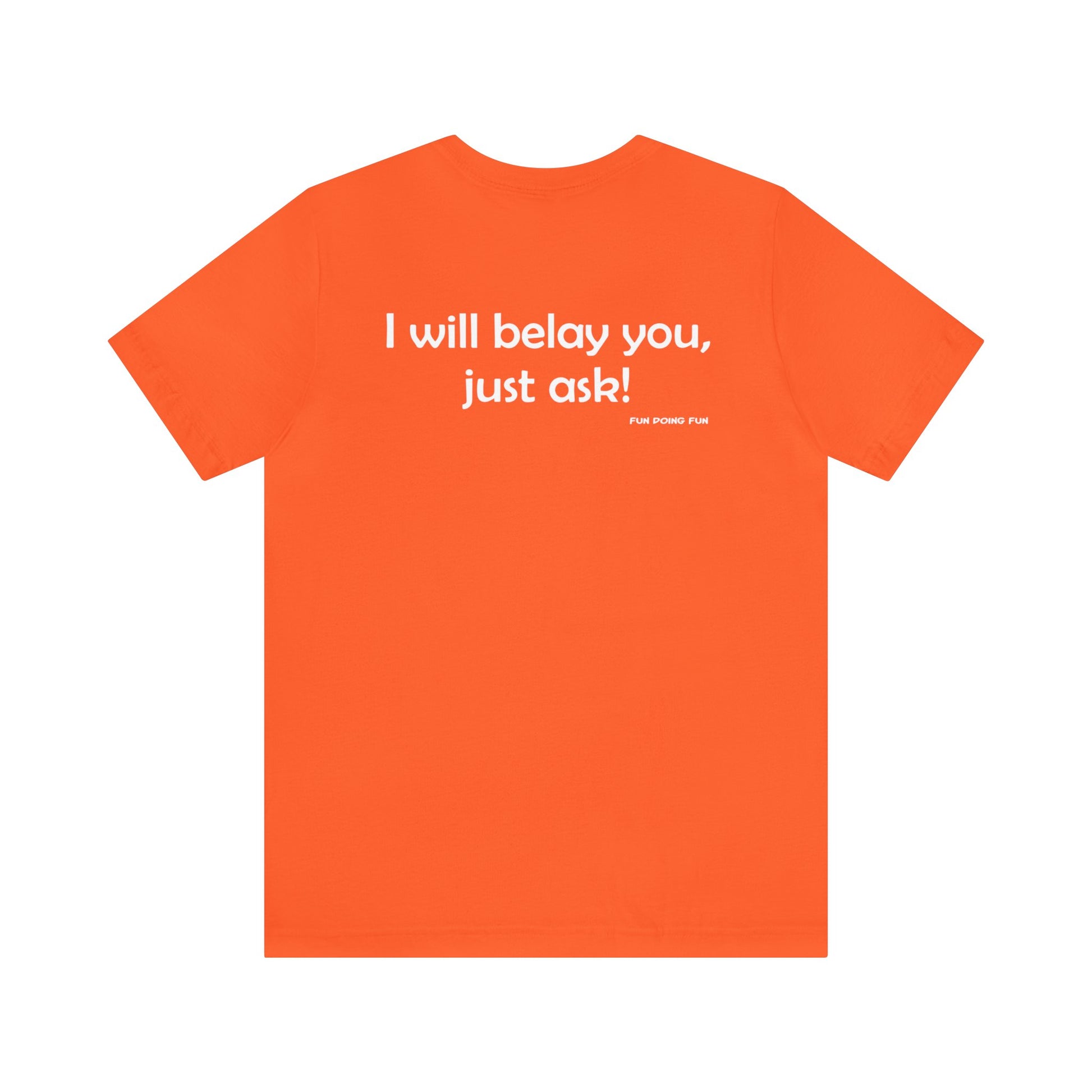 Get Belayed - The idea of this shirt was to let other climbers know you're available to belay or trade belays with them. This shirt has print on the front and the back. For more information please visit